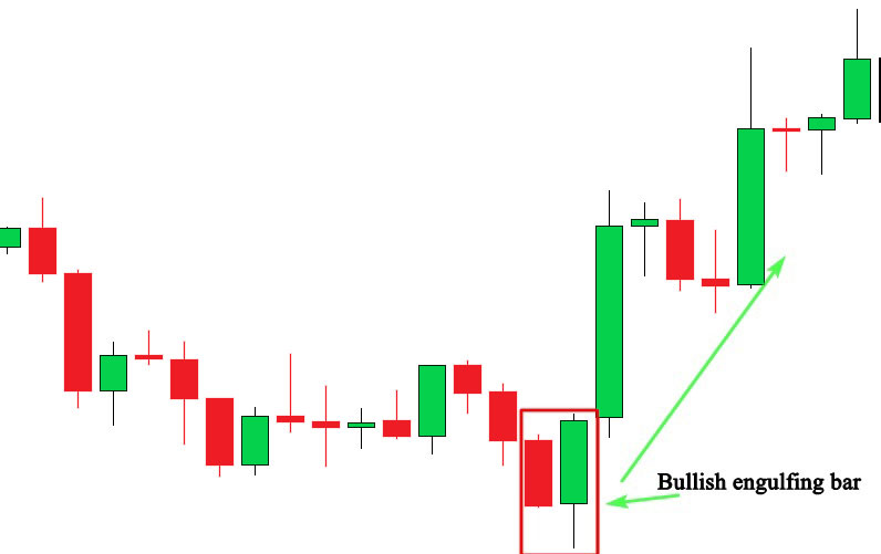 The bullish engulfing bar pattern tells us that the market is no longer under control of sellers, and buyers will take control of the market. When a bullish engulfing candle forms in the context of an uptrend, it indicates a continuation signal. When a bullish engulfing candle forms at the end of a downtrend, the reversal is much more powerful as it represents a capitulation bottom.